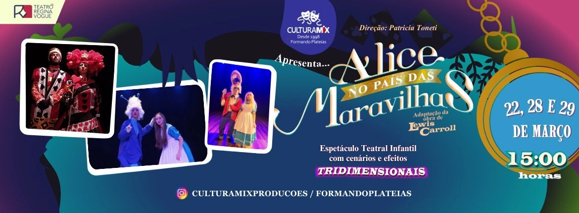 InfantilALICE NO PAÍS DAS MARAVILHAS DATE & TIME: 28 de março de 2026 - 29 de março de 2026 15:00 LOCATION: Teatro Regina Vogue Valores R$40,00 (meia + taxa adm)R$80,00 (inteira + taxa adm) Detalhes Classificação: LivreGênero: Infantil Importante:Não é permitida a entrada de alimentos ou bebidas no teatro Critérios para meia entrada: Idosos, estudantes, doadores de sangue, professores, PcD, Portadores de câncer Comprar ingresso TwitterFacebookPinterestLinkedin