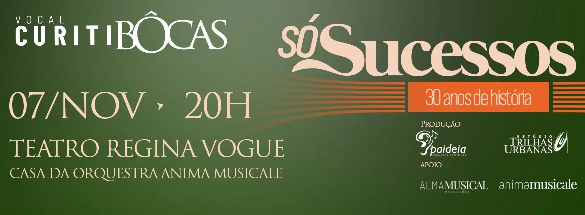 Celebrando 30 anos de trajetória o Grupo Vocal Curitibôcas, da Paideia Escola de Música, apresenta o espetáculo “SÓ SUCESSOS”, um show comemorativo que revisita os momentos mais marcantes de sua história.